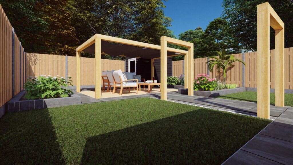 3D-visualisatie met pergola en loungehoek