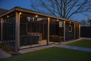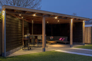 Pergola met sfeerverlichting bij schemer